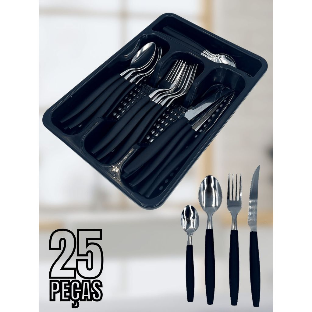 InoxSmart™ – Faqueiro 25 Peças com Porta-Talheres Integrado